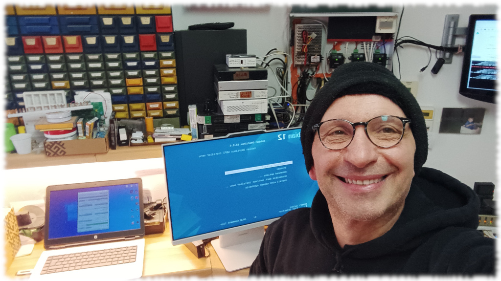 Le immagini che accompagnano questo articolo ritraggono Flavio Camerlino, Tecnico Senior dell’Associazione Punto di Riferimento, durante le fasi di installazione di Debian nei laboratori associativi di Tignale.